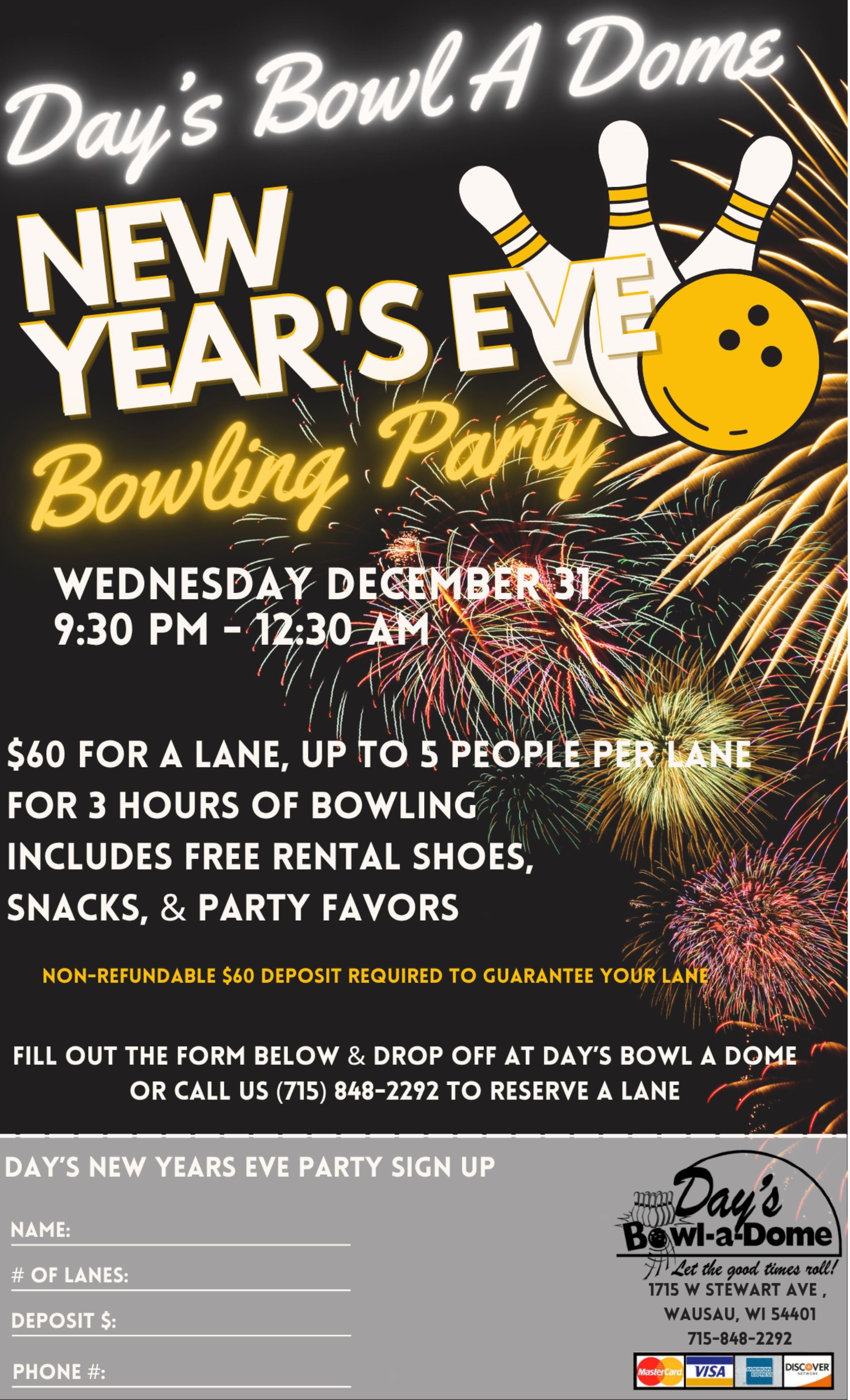 Day’s Bowl-A-Dome, Inc. is comprised of a bowling center, a full-service pro shop, restaurant (Fast Lane Café) and bar. We offer full lunch and dinner menus including appetizers, pizzas, Friday Fish Fry, salads, wraps and specialty sandwiches; lunch catering to local businesses; and bar parties for special occasions such as birthdays, anniversaries, retirement parties, class reunions, etc.