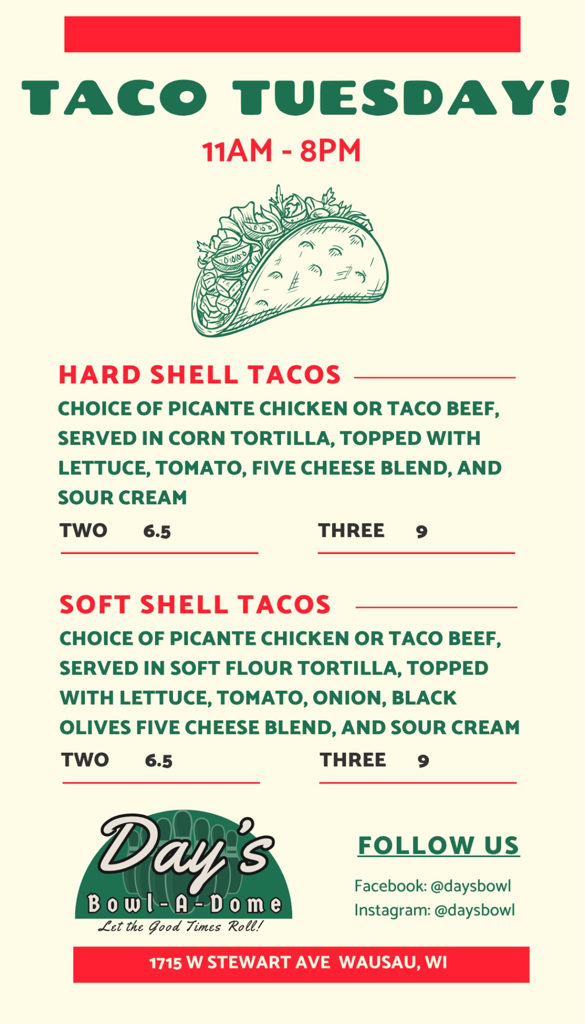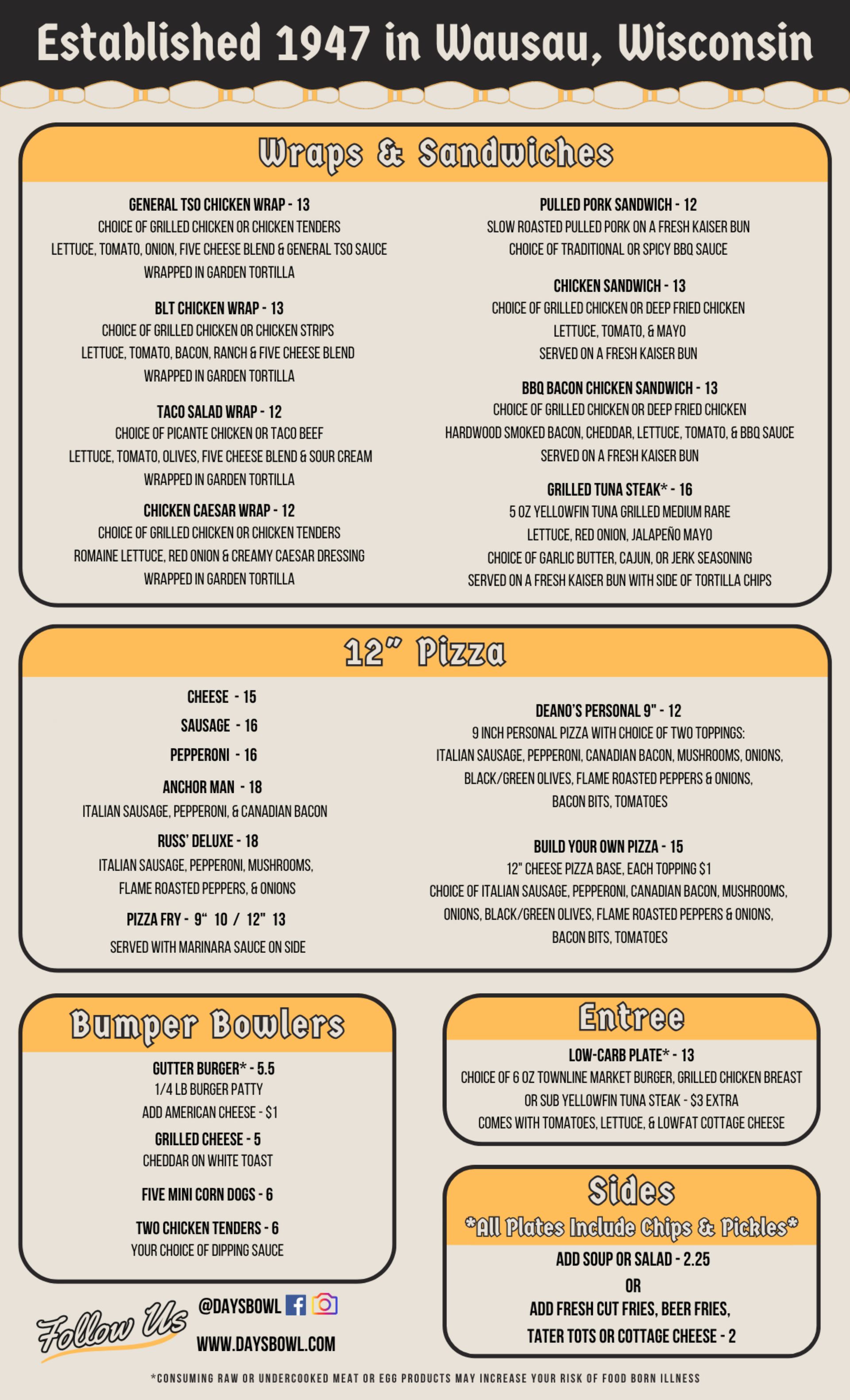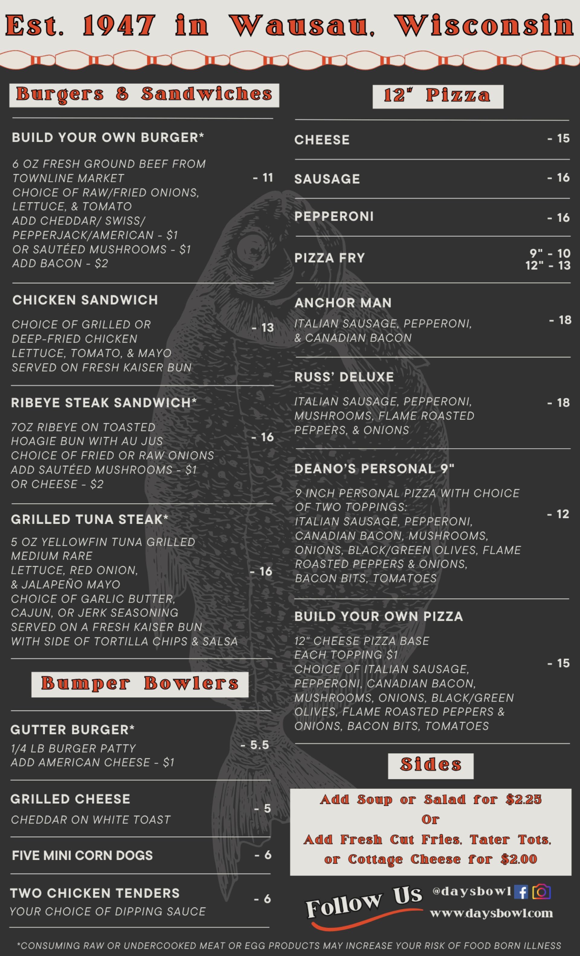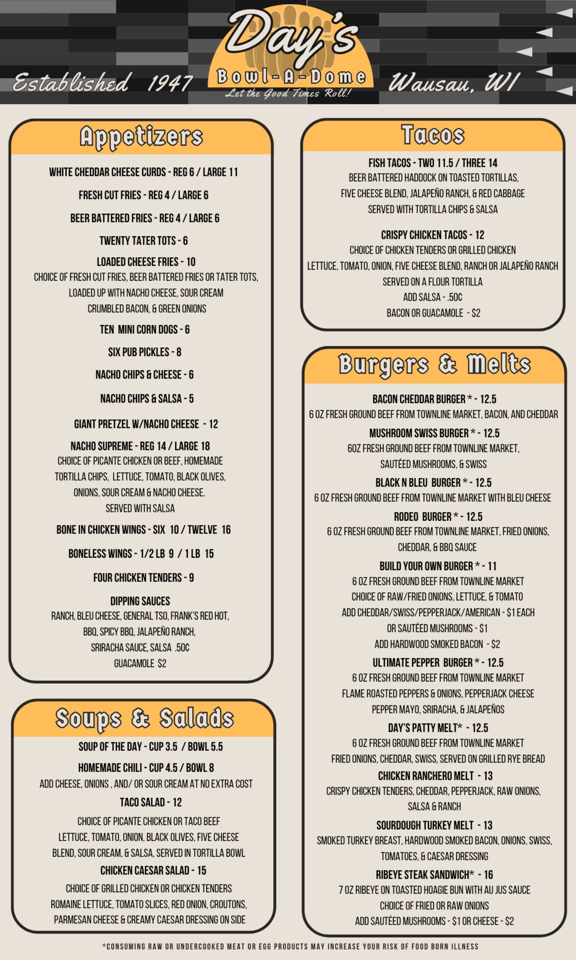 Looking for a bite to eat while you're on the lanes or in the lounge, Day's Bowl-a-Dome has a complete food menu to satisfy your appetite.